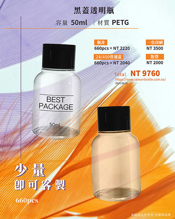 50ml的透明瓶搭配黑色旋轉蓋,660pcs即可印刷圖文LOGO容量:50ml 材質:PETG